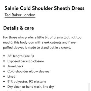 DETAIL: EXPOSED BACK ZIP CLOSURE. JEWEL NECK. COLD SHOULDER RUFFLE ELBOW SLEEVES. LINED