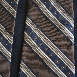 Brown tie with stripes and hand embroidered flowers. Contrasting blue floral band on back. This tie is a slightly older style tie, still in excellent condition. Approximately 3 1/4" by 58 3/4"