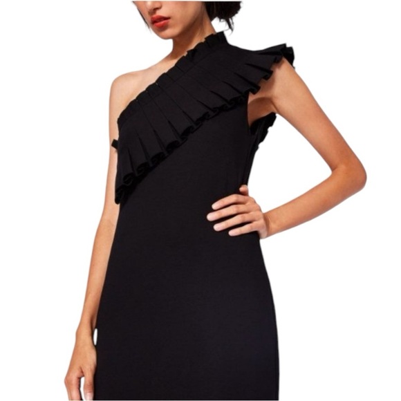 Perfect little black dress for any event. Ruffle detail over the shoulder. Tag reads Ted Baker size 0 which is the equivalent to US 2