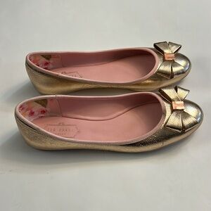 Size 8 Ted Baker London pink / gold metallic ballet flats in gently pre owned condition. Cute bows on toes