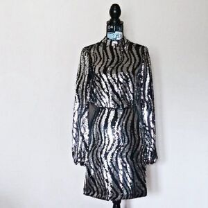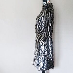 TED BAKER Sequin Mini Dress Animal Striped Print Mock Neck LS Silver Sz 0-2 / XS