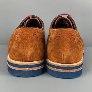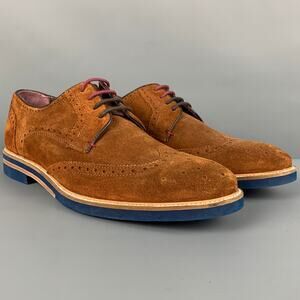 TED BAKER shoes comes in a brown perforated suede featuring a wingtip style, contrast stitching, and a two toned lace up closure. Made in Italy.