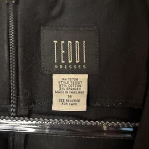 The TEDDI Dresses Women's Floral Embroidered Dress in size 14 is a vintage-inspired piece made of cotton twill fabric. This sleeveless dress features a round neckline, black color with floral embroidery, and a midi length with a sheath style. It is perfect for a casual occasion with a zip closure and convenient pockets. The dress is machine washable and handmade in Thailand, making it a unique and stylish choice for the summer, fall, or spring seasons.