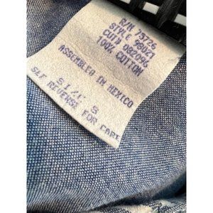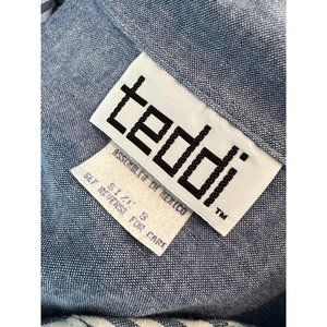 TEDDI Vintage Shirt SMALL Denim Chambray button front, short sleeve. 100% Cotton Made in Mexico. Perfect for gardener garden flower florals flowers. Pit to pit 21", back bottom of collar to bottom of shirt 27". Two faux front pockets. Great preowned condition with no rips or stains. Makes a great gift for the green thumb!