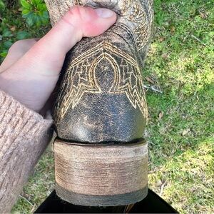 This beautiful silver and gold overlay and embroidery cross with wings design has been an all-time favorite. The design contrast beautifully against the worn-out leather. These boots have a style of rugged elegance.