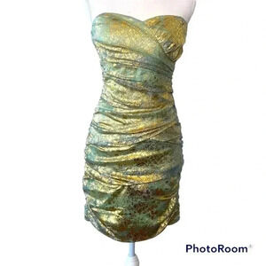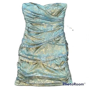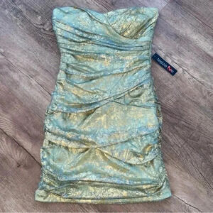 Teeze Me Party Dress Bodycon Gold & Turquoise Green Size 9 NWT. Lots of glitter & sparkles. Watch video for details. Measurements are in the pictures. Let me know if you need anything else. Thanks & Happy Poshing.