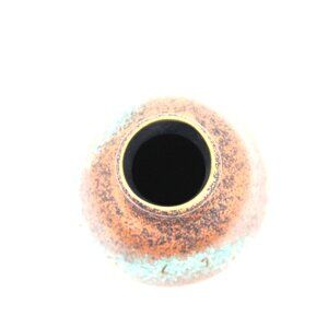 The Teissedre Designs Turquoise Bronze Splatter Sponge Pottery Vase is a unique and handmade piece featuring a Kokopelli Design. Crafted from clay and ceramic, this round planter showcases a beautiful blue color with a splatter sponge technique. Signed by Teissedre Designs "TD"1998 MUSIC VINTAGE