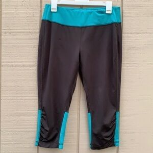 Smooth gray fitted workout capri’s with turquoise textured waistband and detail on legs. Small pocket on waistband. Ruching at knees.