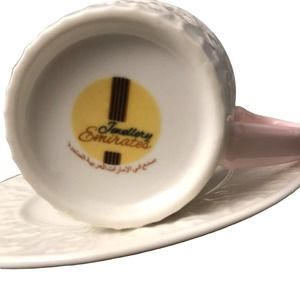 Espresso Cup and Saucer by TEKBIR Jewellery Emirates Fine Porcelain with raised flower and vine design. Handle is painted in a soft kiss pink. A lovely set to enjoy your morning espresso.