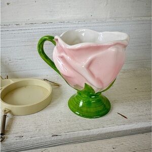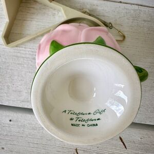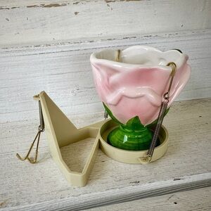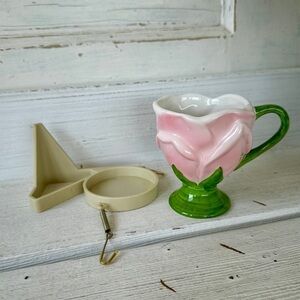 TELEFLORA, PINK TULIP CUP WITH HOLDER. CUP IS IN EXCELLENT CONDITION. NO CHIPS OR CRACKS. TELEFLORA MARKING ON BOTTOM. HOLDER IS FOR CUP & MATCHING SAUCER. ONE WIRE HOOK HOLE IS BROKEN(shown in picture). CUP MEASURES 4 1/4”W X 3 5/8”H