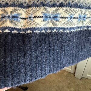 Blue and white Nordic, elbow patches, ribbed cuffs and hems, contrasting sleeves, pit to pit 19, length 29”