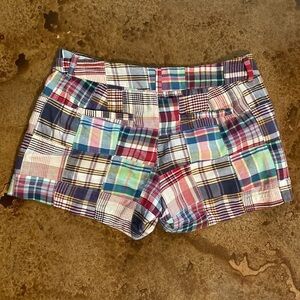 Telluride Clothing Co. plaid patchwork flat front cotton shorty shorts. Size 2, cotton, approximately 3” inseam, see pictures for details.