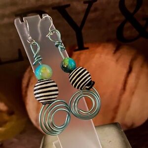 Tempo - is designed with a beautiful blue plastic coding around copper wire with a twirl effect, it has a black and white cotton paper texture ball bead topped by a multi colored glass bead. HANDMADE AND ONE OF A KIND