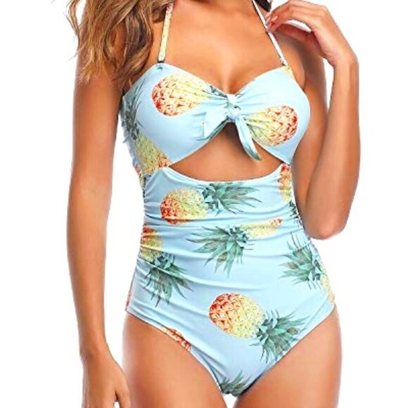 TEMPT ME Blue Skies and Pineapples Cut-Out Halter Tie One Piece Swimsuit SIZE SMALL NWT