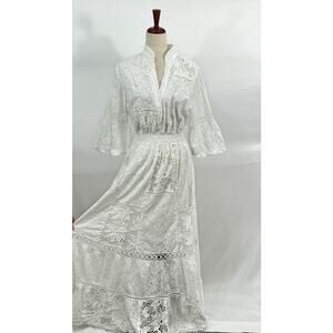 Women's dress by TEMPTATION POSITANO. Size L Large. Pompei style. white, 3/4 sleeve, maxi length, lace, 100% cotton. Good condition, no stains, holes or pilling. Size label at neck is coming away from label.