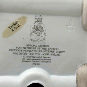 This piece was exclusive to the ENESCO Precious Moments Collectors' Club and was issued to commemorate 10 years of precious moments. Comes with original box and tags. No chips, cracks or crazing.