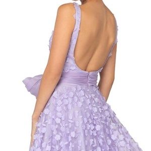 A-line gown with floral appliqués and big bow trim by Terani CoutureExude a glamorous appeal with this ballgown designed by Terani Couture. It showcases a fitted bodice with a stunning deep V-neckline secured at the plunge with a sheer inset. The bold backless design is accented by the sash of the big bow trim accenting the waist. The gown is entirely embellished with floral appliqués.