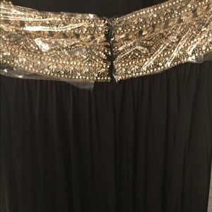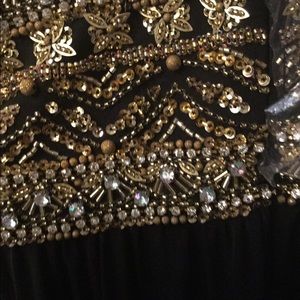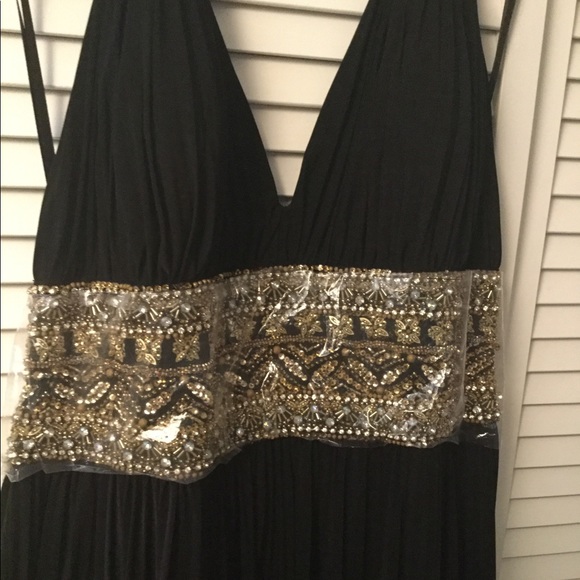 Brand new maxi pleated halter black dress, with gold sequins beaded work to the waist area with an open back. Fits a size medium up to size 10, Bra cup size C, possibly a small D