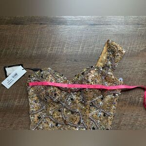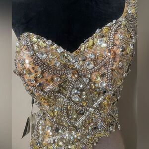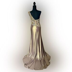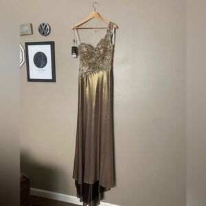 What an amazing find this Terani couture gown is...stunning in a bronze-like brown and NWT. It retails for over $450. The polyester material is silky satin dream and the beads are Devine. Size 8