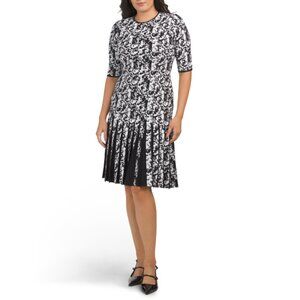 TERI JON Black/white Double Knit Printed Short Sleeve Box Pleated Dress