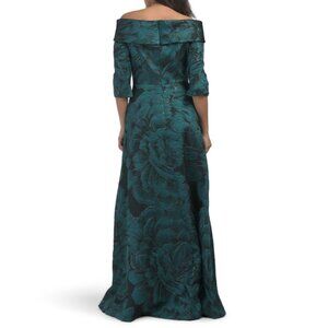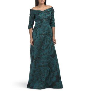 Brand New Color: Teal Multi metallic accents, floral jacquard overlay, fully lined, foldover neckline, textured finish elbow sleeve, off the shoulder, gown 58in long, taken from size 6 back zip closure polyester/silk/acrylic/polymetal/polyamide imported Not returnable in store dry clean