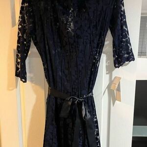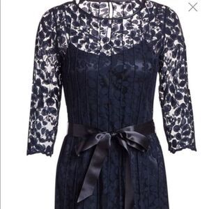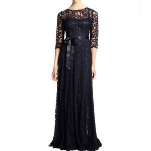 Brand new with tags Teri Jon lace pintuck navy gown size 4. Three quarter sleeve and illusion neckline