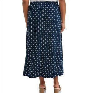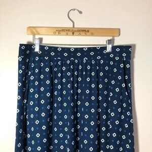 Plus Size Women Clothes Size 0X (14W). Wide fit. Terra & Sky. Navy blue, white, blue cove geometric print pattern maxi skirt. Super soft! Two front side slits. Pull on elastic waistband. Generators fit, breathable. 90% polyester 10% spandex. Spring, Summer, Fall outfit! Dress up or down. FRONT POCKETS!
