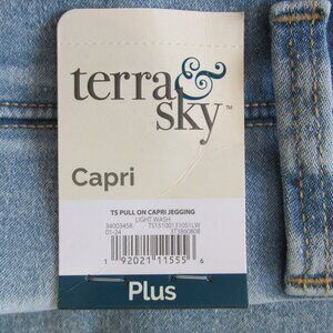 TERRA & SKY WOMEN'S SIZE 3X (24 W / 26 W) CAPRIS JEANS LIGHT BLUE WASH JEGGINGS PANTS NWT. Fabric: 61% Cotton, 24% Polyester, 14% Rayon, 1% Spandex. 2 pocket twill weave stretch denim cropped jeans. Color on tag: "LIGHT WASH". Elastic waist pull on jeggings. Mock front fly. 2 mock pockets in the front. 2 patch pockets in the back. 2 inch slit opening at outside leg seams keeps leg hems from riding up. 5 belt loops. Yoke in back. Light gold top stitching. In my opinion these are made for women with fuller (larger) hips and thighs. They look lumpy on the sides of women with straight hips and thighs. Stock photos on model used. The pictures show the exact item you are purchasing. ** Color may be slightly off due to monitor color setting/flash of camera **.