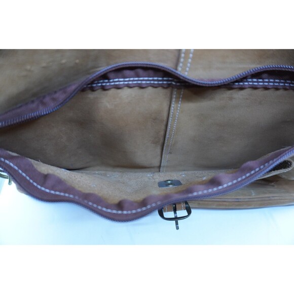 This vintage Territory Ahead leather briefcase/messenger bag is made in the United States from heavy saddle leather. It features a brown color, brass hardware, shoulder strap handle, and adjustable straps. The bag is extra large in size and has a lining made of leather. It is suitable for travel, casual, workwear, and business occasions, with a classic button and buckle closure. Made in the 1990s, this handcrafted bag is eco-friendly and perfect for business use.