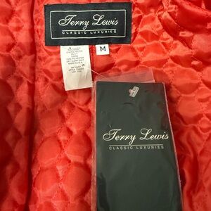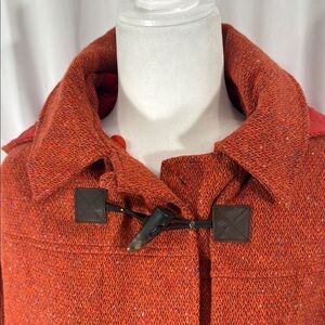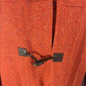 Terry Lewis coat, toggle coat, hooded coat, rust orange jacket, wool blend coat, fall winter outerwear, women’s medium coat, classic luxuries coat, USA made coat, quilted lining coat, duffle coat style, toggle closure jacket, Terry Lewis Classic Luxuries
