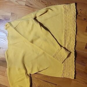 Yellow sweater with crochet trim on bottom hem and wrist part of sleeves.