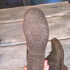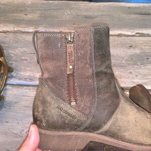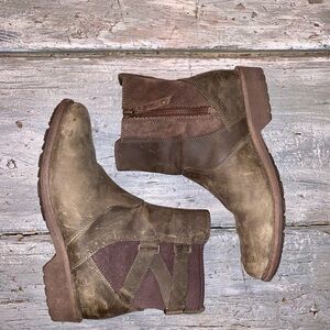 Teva Ellery Leather Waterproof Ankle Boots 6.5. Great used condition. Side zipper closure and double crossed straps on outer sides. Distressed looking leather. Brown.
