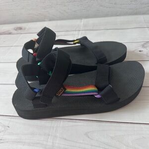 Celebrate comfort and pride with these brand new with tags Teva Universal Midform sandals in a men’s size 11. These iconic sandals feature adjustable black straps with rainbow webbing details and a supportive mid-height platform sole. Designed for all-day wear with a cushioned EVA footbed and durable rubber outsole.