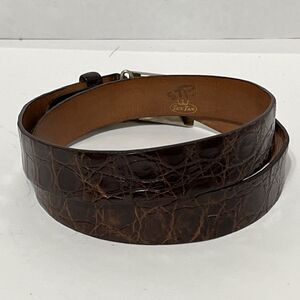 This product is a stylish brown alligator belt with a silver tone swank buckle, perfect for adding a touch of Western flair to any outfit. Made of crocodile/alligator leather with a cowhide lining, this adjustable belt is designed for a size 26 waist. The metal hardware gives it a touch of sophistication, making it a versatile accessory for both casual and dressed-up looks. Perfect for those who appreciate unique and eye-catching items, this belt is sure to make a statement.
