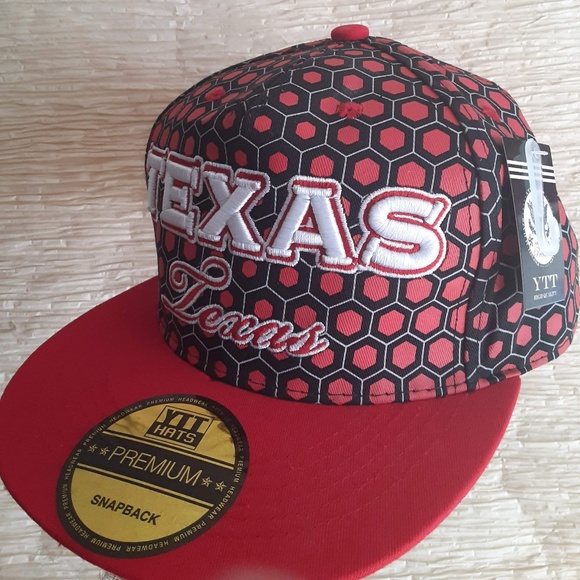 Black and red honeycomb pattern and white and red TEXAS embroidered letters.