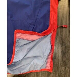 2 front pockets. Elasticized bottom hem. On the side, from the bottom up, is a 1/4 zipper that opens from the bottom hem up. Red zipper pull has some color worn off.