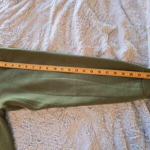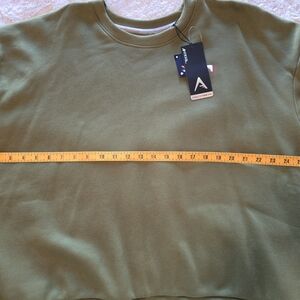This Antigua sweatshirt features a muted olive green color and a classic crewneck style. Made from a soft fleece-like fabric, it has ribbed cuffs and neckline that match the body color, along with two small embroidered designs on the left chest area.