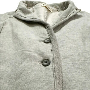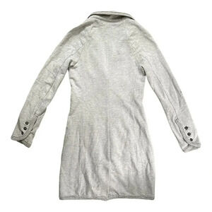 Beautiful long cardigan/duster from TEXTILE Elizabeth & James. Soft, gray sweatshirt material; structured collar; button front and cuffs. Small snag on back of the right arm (pictured), but in otherwise excellent condition