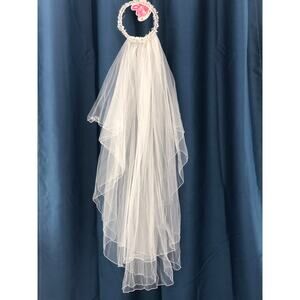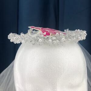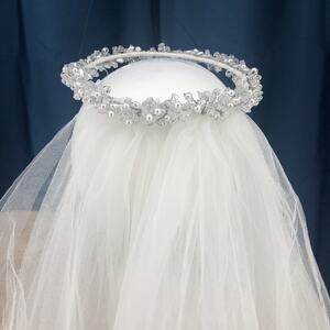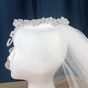T&G VINTAGE 90's (39in) White Faux Pearl Crystal Wire Beaded Bridal Halo Veil