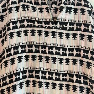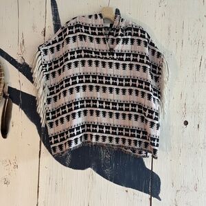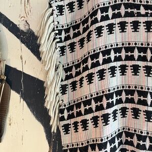 This pull over pawn show with hoodie is a great addition to any wardrobe is the ultimate in Bohemian comfort! It’s tribal, print with stripes with multicolors streaming through of pink, green, black and blue and fringe sleeves.