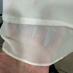 Crew neckline. Long sheer sleeves with button cuffs. Tulip back shoulder detail. Center pleat. Sheer hemline. Shift silhouette. Ivory white. No stretch. Delicate. Chic. Neutral. Timeless. Effortless. Bridal. Sophisticated.