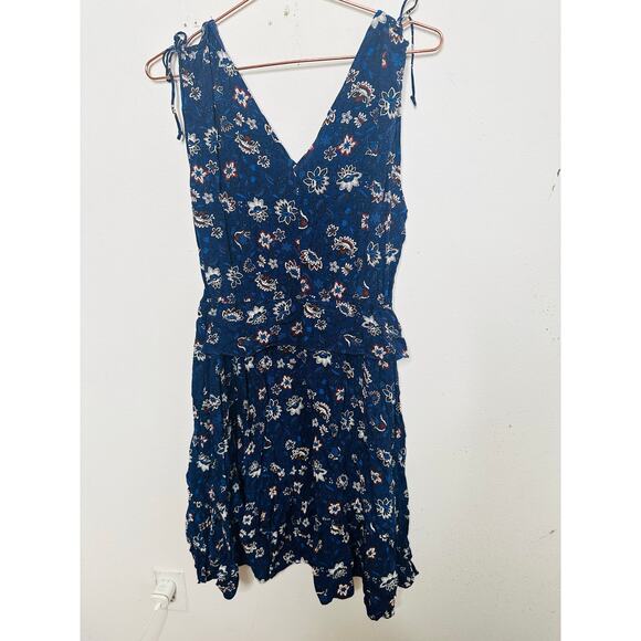 THAKOON Navy Lotus Print Shirred Waist Ruffled Hi-Low Hem V-Neck Dress size 2