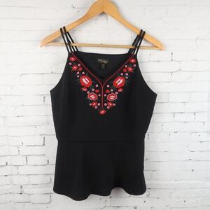 THALIA SODI BLACK SLEEVELESSS V NECK PEPLUM TOP WITH FLORAL EMBROIDERY SIZE S