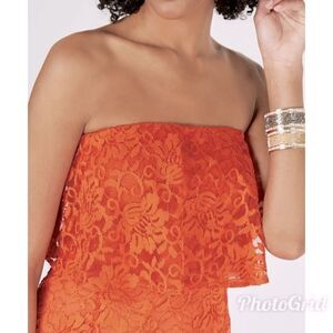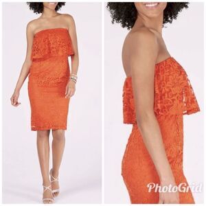 THALIA SODI Strapless Lace Cocktail Dress Midi Fitted Popover Orange Medium New