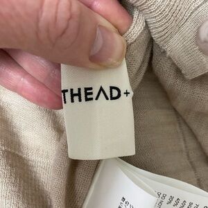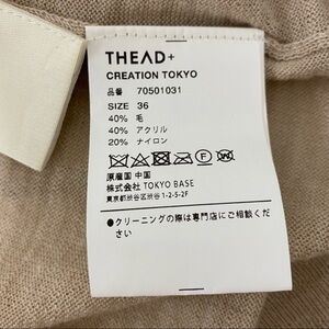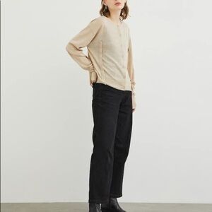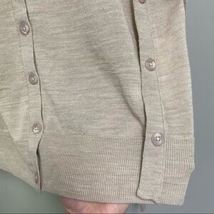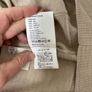 Japanese designer THE AD+ Studious Creation Tokyo Merino blend cardigan. Long sleeves. Button closure at front. Boxy relaxed shape. Button detail at cuff on sleeves