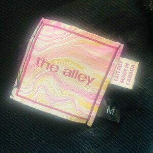 THE ALLEY black dress with silver and gold threads with a timeless appeal and fit-and-flare style that flatters any figure. Long sleeves, round neckline, short back zipper and elasticized waist. Pit to Pit 19 Inch, Skirt Length 28 Inch. Polyester/ Elastane stretchy fabric Machine wash cold water. Very Good condition Made in Canada Size M.