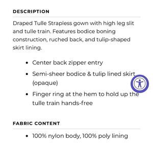 Draped Tulle Strapless gown with high leg slit and tulle train. Features bodice boning construction, ruched back, and tulip-shaped skirt lining.
