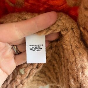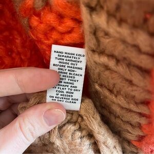 THE CASHMERE PROJECT Hand Knit Open Front Chunky Cardigan Sweater. Camel and bright orange chevron pattern. Hand-knit supersoft threads elevate the feel of a open-front cardigan sweater featuring a bold zigzag pattern. Long sleeves. Feels like cashmere - actually man made materials.