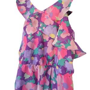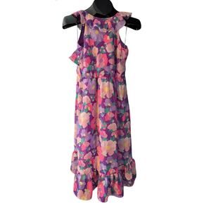 Beautiful purple, pink, green, and yellow abstract floral spring sleeveless dress with a ruffle across the front.