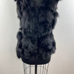 THE CUE by Cher Qu Black Fur Vest Belted Waist Hook & Eye V-Neck Size Small